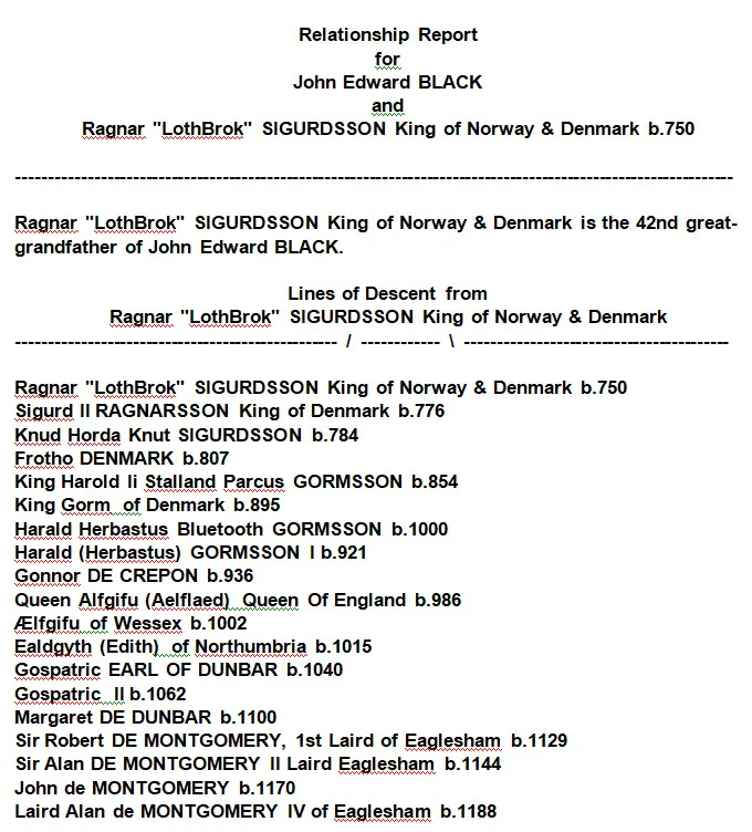 Ragnar Lodbrok SIGURDSSON, Legendary King of Denmark and Sweden, was born about 767 in Uppsala, Uppsala, Sweden. He died in 845 in Northumbria, England. He was buried in 845 in Uppsala, Uppsala, Sweden. Ragnar married Aslaug Sigurdsdottir WOLSUNG in 783 in Århus, Denmark. Aslaug was born about 755 in Ringerike, Buskerud, Norway. She died in 870 in Ringerike, Buskerud, Norway.