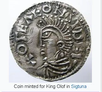 When he stamped coins in Sigtuna in the province of Uppland Olof used the word rex for king. OLUF REX as in the coin displayed above or OLAF REX. The use of Latin seems to suggest that he was already baptised at this time but on the other hand the coins were imitating English pennies in type and style.